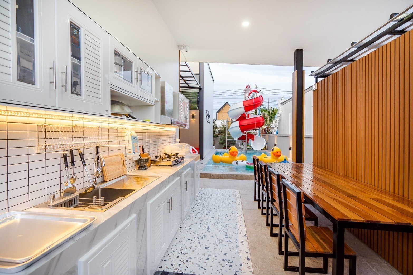 ครัวไทยนอกตัวบ้าน พร้อมจาน ชาม หม้อ กะทะ