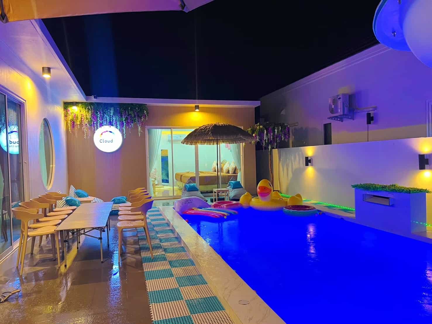 สระว่ายน้ำขนาด 3 × 7 เมตรพร้อมไฟเปลี่ยนสีและหัวพ่นสปาจากุชชี่ ในสระ
