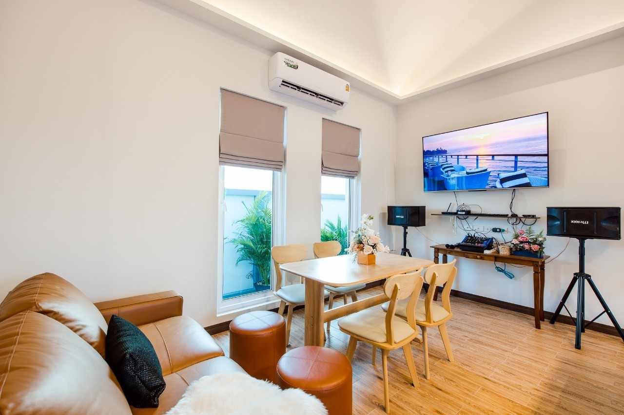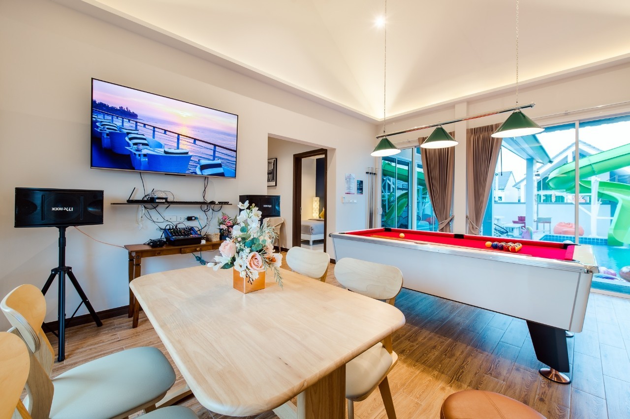 บ้านชั้นเดียวทรงนอร์ดิก 3 ห้องนอน 3 ห้องน้ำ ห้องโถงใหญ่ แอร์ทั้งหลัง โต๊ะพูล คาราโอเกะ ทำอาหาร-ปิ้งย่างได้ มีอุปกรณ์ครัวครบครัน
