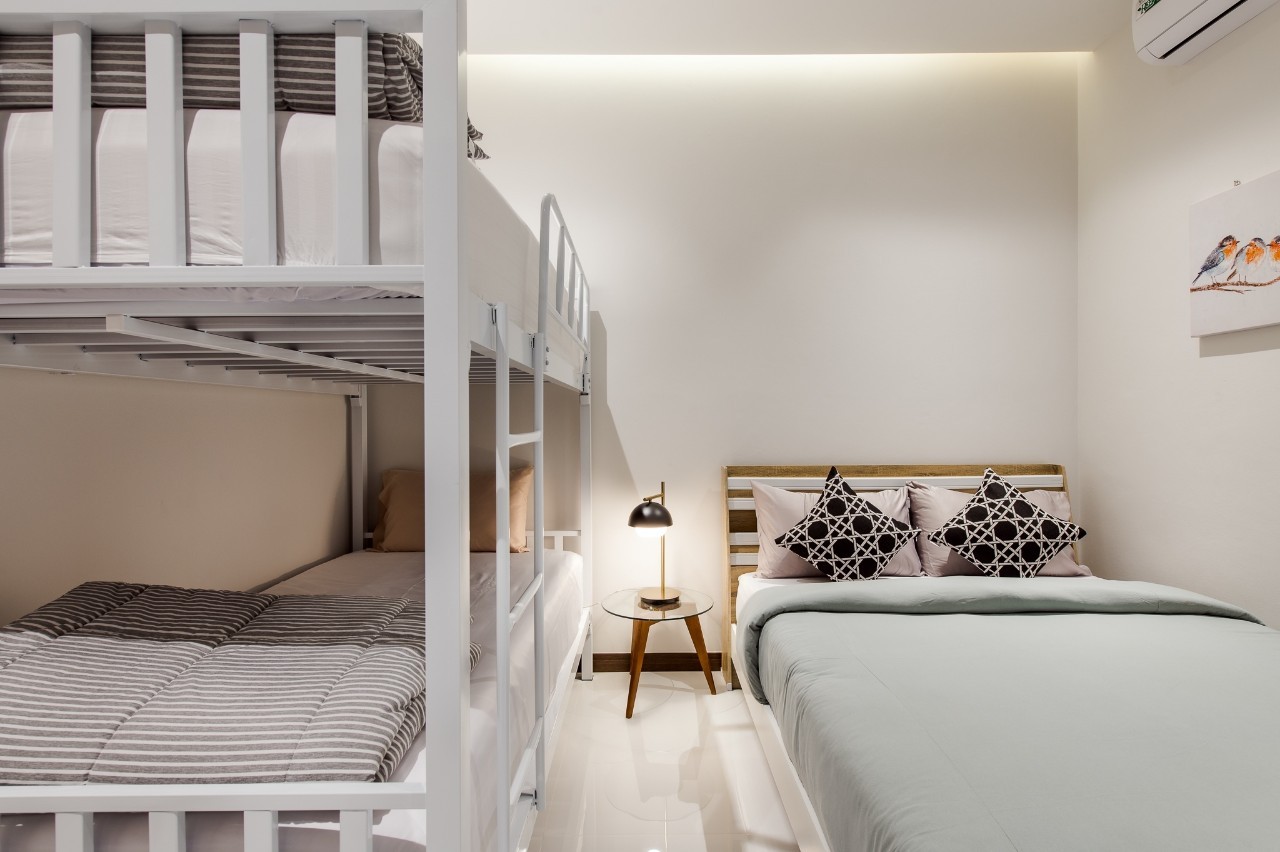 - ห้อง 3 เตียงขนาด 5 ฟุต 1 เตียง เตียง 2 ชั้น 1 เตียง ห้องน้ำส่วนกลาง